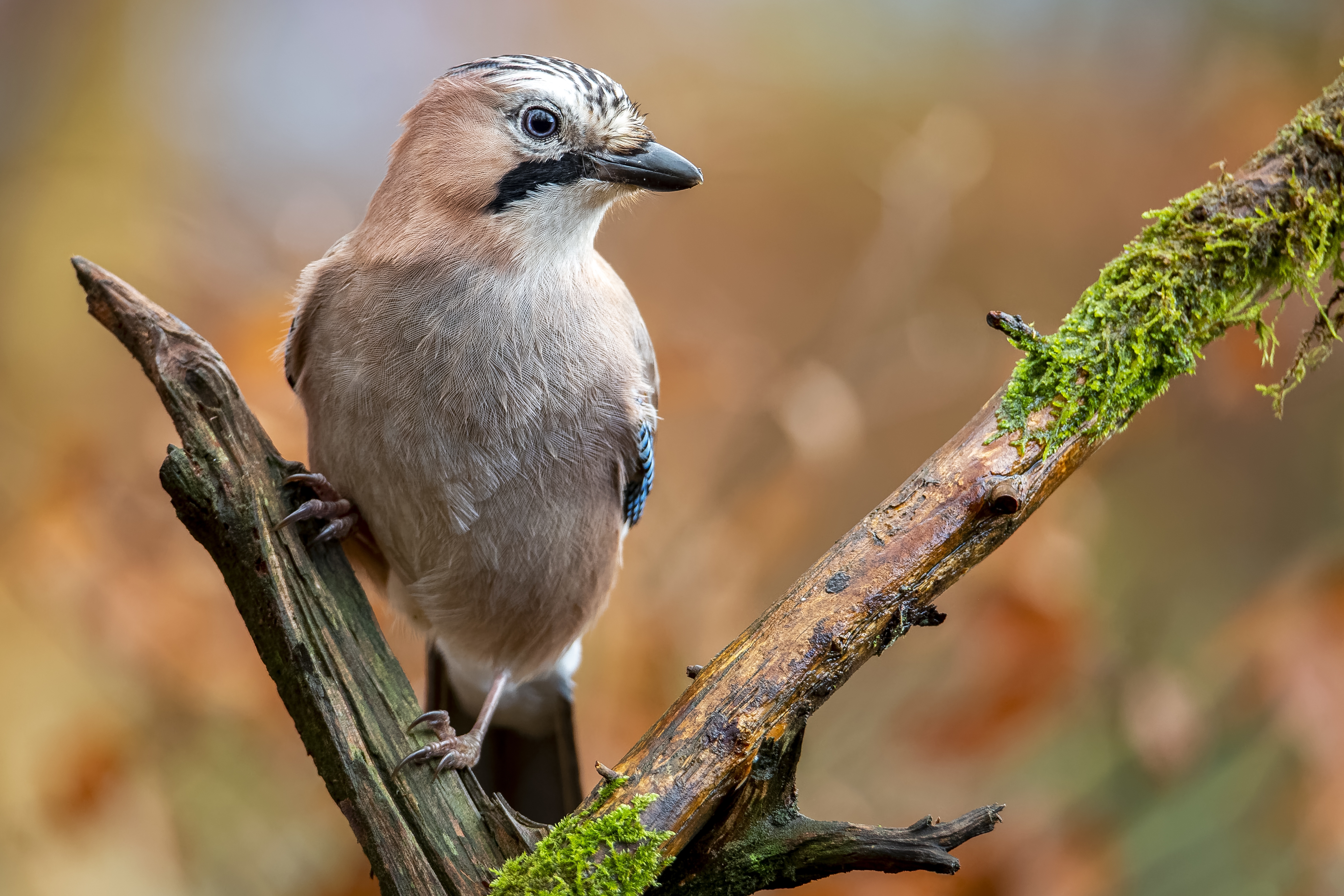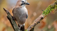 Closeup shot of a Eurasian jay sitting on a branch with a blurry background