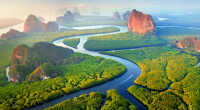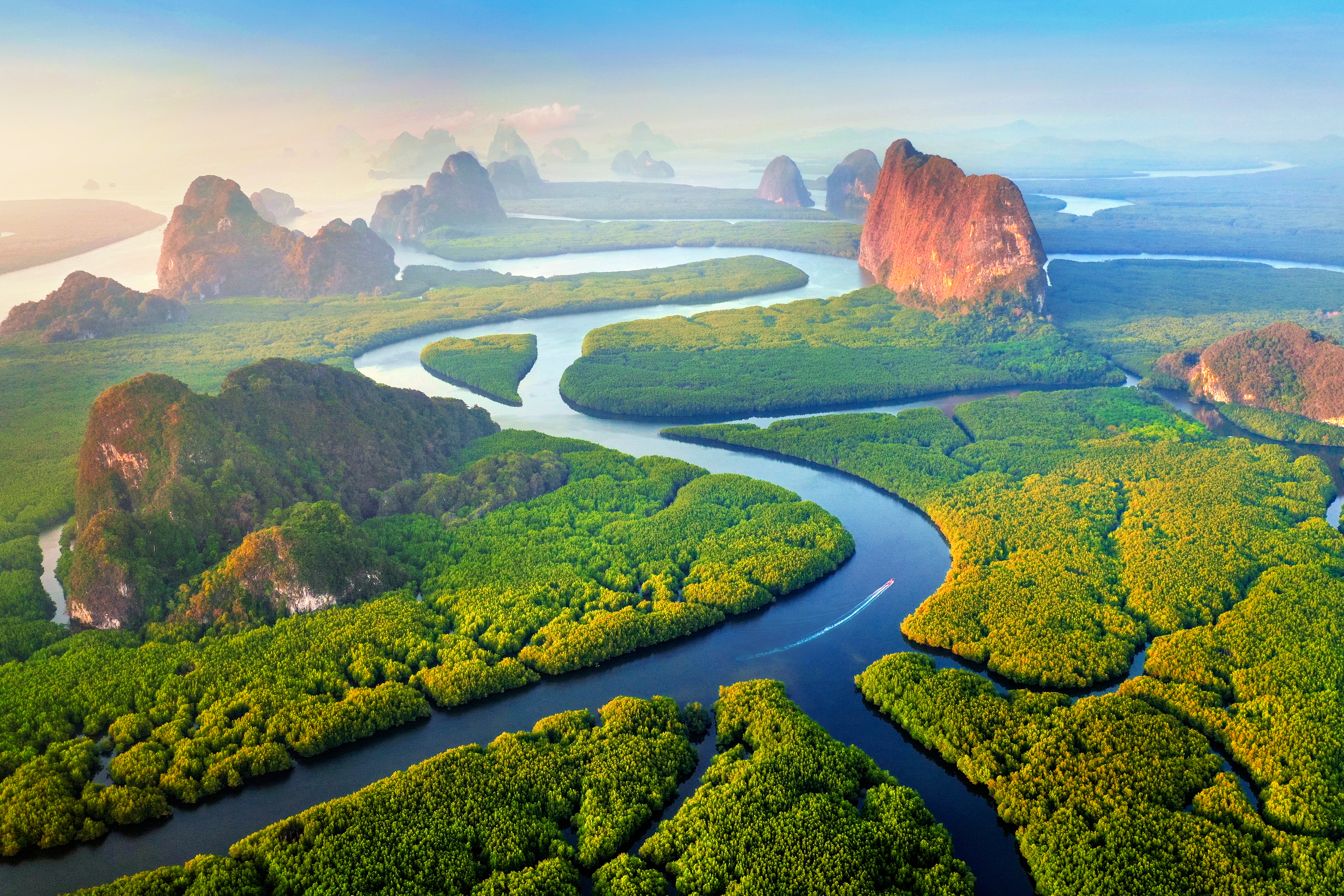 Aerial view of Phang Nga bay with mountains at sunrise in Thailand.