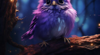 A cute purple bird with feathers that sparkle like stars perched on the branch of an ancient tree in a fantasy world with a magical forest background, hyper realistic concept art --ar 2:3 --v 5.2 Job ID: d50da8f6-4518-4837-9925-cab3021e4125