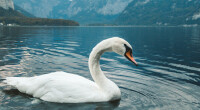 Vertical shot of a white swan swimming in the lake in Hallstatt. Austria