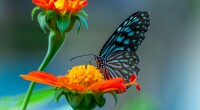 Closeup shot of a beautiful butterfly on an orange-petaled flower with a blurred background